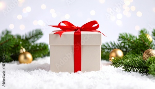 Festive Christmas Gift Box with Red Ribbon and Snowy Ornaments, Evoking Holiday Cheer
