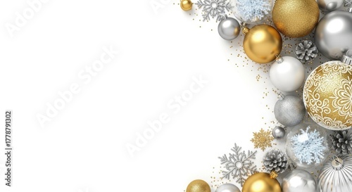 Festive Christmas ornaments and decorations on a white background with copy space