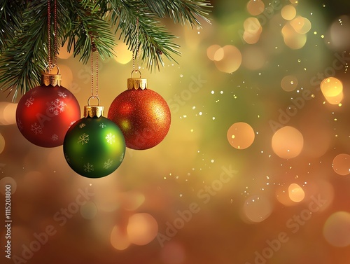 Festive Christmas ornaments hanging from a pine branch, with a bokeh background of warm holiday lights.