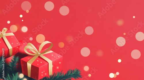 Festive Christmas Scene with Red Gift Boxes and Evergreen Branches on Red Bokeh Background