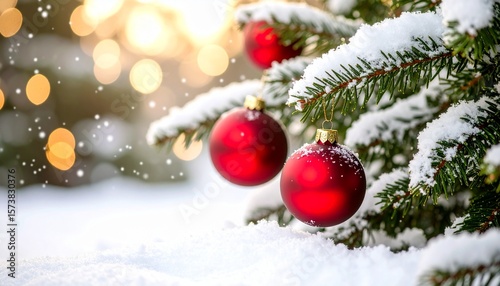 Festive Christmas Scene with Red Ornaments Hanging on Snowy Branches