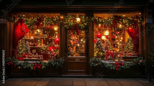 christmas, shop, window, display, night, festive, light, garland, decoration, red, green, ornament, tree, present, gift, bow, snow, winter, magical, enchanting, holiday, season, joy, cheer, warmth, cosy, sparkle, glistering, ambience, atmosphere, wonder, happiness, celebration, tradition, family, togetherness, love, peace, merry, bright, beautiful, elegant, classic