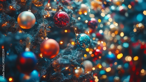 Festive Christmas tree adorned with colorful baubles and twinkling lights