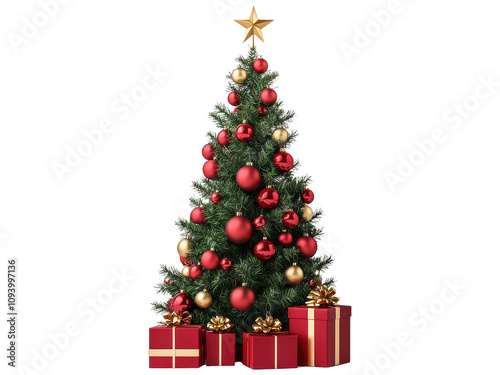 Festive Christmas Tree Decorated with Red and Gold Ornaments Surrounded by Colorful Wrapped Gifts for a Joyous Holiday Celebration