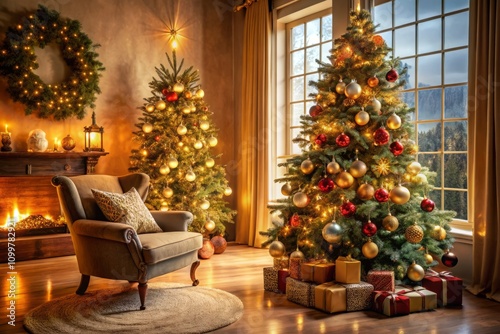 Festive Christmas Tree in a Cozy Holiday Interior with Ample Copy Space for Text or Messaging