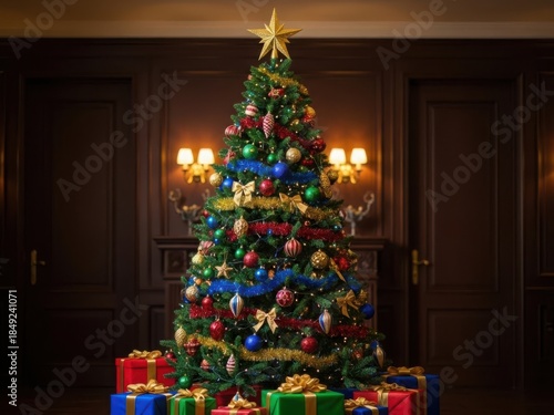 Festive christmas tree with ornaments and gifts