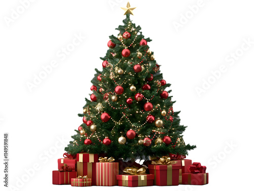 Festive Christmas Tree with Red and Gold Ornaments Surrounded by Presents