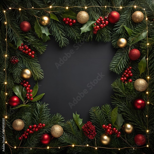 Festive christmas wreath with ornaments and lights on black background