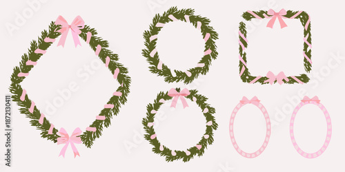 christmas, chaplet, frame, decoration, holiday, pink, ribbon, evergreen, pine, fir, seasonal, celebration, ornament, festive, winter, design, illustration, graphic, vector, graphic design, holiday season, decorative, cheerful, joyful, celebratory, greeting, card, background, pattern, elegant, stylish, modern, simple, minimalist, arrangement, christmas tree, holiday spirit, circular, square, oval, festive season