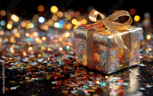 Festive confetti bursts around gift, detailed ribbon lighting and surface.