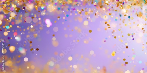 Festive confetti shower against vibrant purple, gold gradient background. Colorful confetti pieces float, sparkle creating joyful atmosphere. Perfect for celebrations like parties, events. Festive