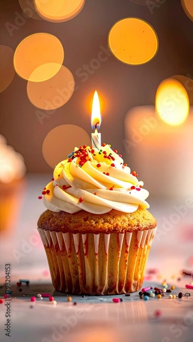 Festive cupcake with a single lit candle, white frosting, and sprinkles