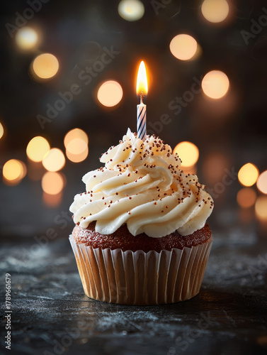 Festive cupcake with lit candle and blurred bokeh lights perfect for celebrations.