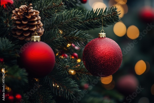 Festive decoration with red Christmas ornaments and pine branches – Perfect holiday atmosphere