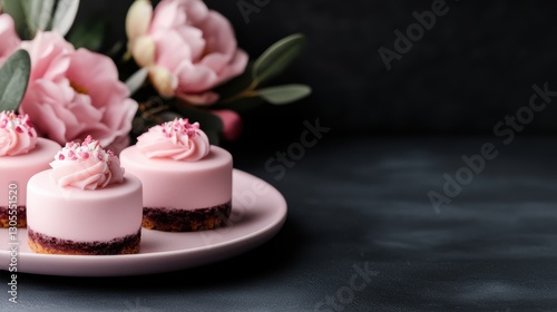 festive dessert display, small bento cakes on a pastel plate, with fresh flowers and womens day decor, bathed in soft natural light