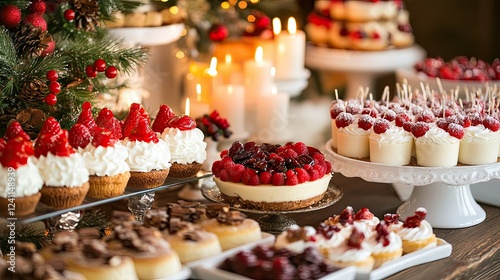 Festive Dessert Table with Assorted Cakes and Berries Display
