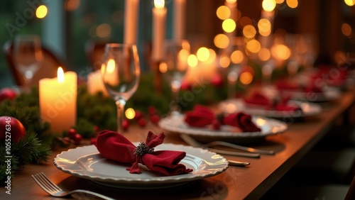Festive dinner table adorned with red napkins, sparkling glassware, flickering candles, and holiday decorations. Warm, inviting, and elegantly set.