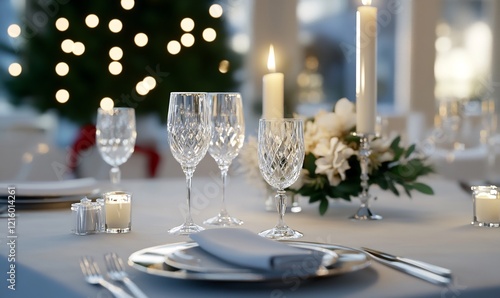 dinner, table, setting, festive, glassware, christmas, light, elegant, holiday, card, food, party, celebration, tableware, eatery, luxury, wine, goggles, candle, flower, white, silver, background, design, style, home, decoration, event, occasion, christmas tree, bokeh, romantic, winter, feast, ambience