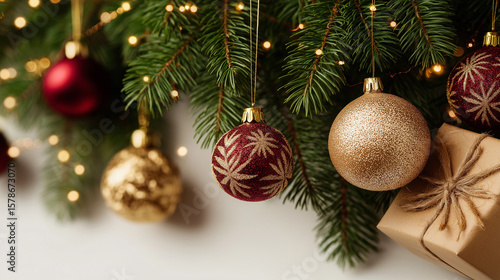 Festive Embellishments: A close-up image of holiday season ornaments, the Christmas tree, evokes a sense of joy, tradition, and festive spirit.
