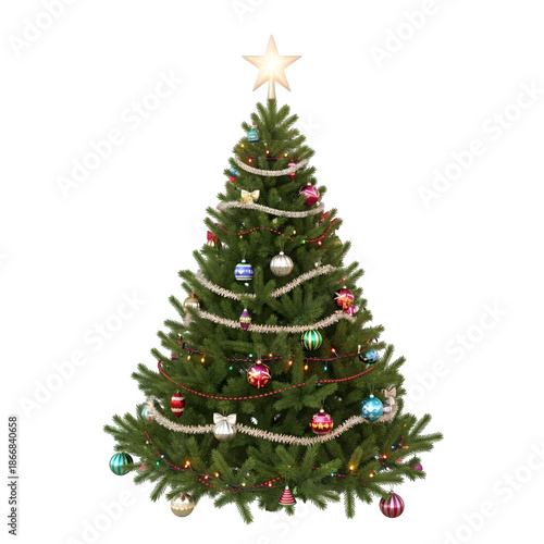 christmas, tree, evergreen, festive, ornament, star, holiday, christmas, decoration, decorated, winter, celebration, seasonal, tradition, festivity, green, pine, fir, spruce, isolated, white, transparent, cut-out, object, design, template, greeting, card, symbol, classic, joy, cheer, ornamental, party, new year, religious, nature