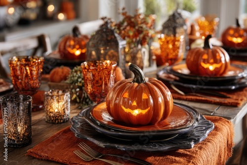 fall, pumpkin, centrepiece, party, festive, autumn, decor, orange, linen, plate, glowing, warm, seasonal, celebration, holiday, gathering, table setting, decoration, cosy, inviting, rustic, elegant, harvest, thanksgiving, halloween, ambience, candlelight, dining, home, interior, design, style, arrangement, hospitality, event, occasion, autumn, tableware