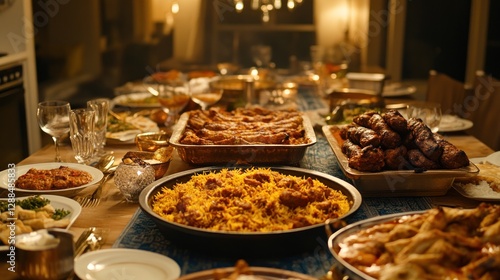 Festive family dinner, lavish spread, home, warm lighting, celebration