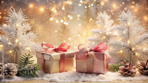 holiday, christmas, gift, present, bow, ribbon, festive, snowy, winter, pine, tree, light, twinkle, sparkle, snow, background, celebration, season, decor, decoration, joyful