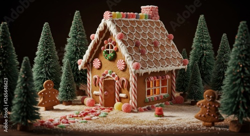 Festive Gingerbread House nestled in a Miniature Christmas Tree Forest