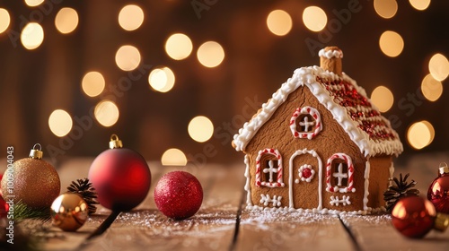 Festive gingerbread house surrounded by Christmas ornaments