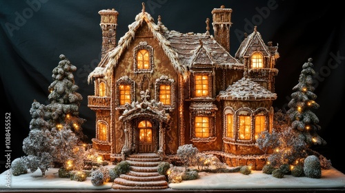 Festive Gingerbread House with Snowy Roof, Illuminated Windows, Surrounded by Pine Trees and Glittering Decorations for Holiday Cheer