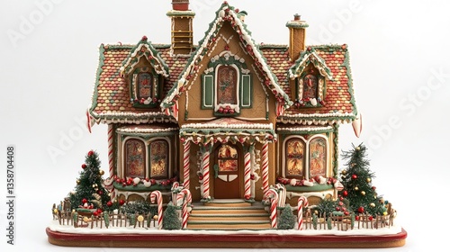 Festive gingerbread house with sugar windows candy canes and gumdrops bright colors clean and sharp on white backdrop frontal view.
