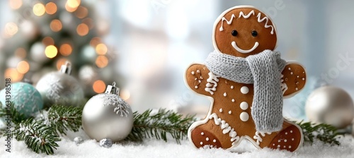 Festive Gingerbread Man in a Cozy Knitting Scarf Surrounded by Colorful Holiday Decorations