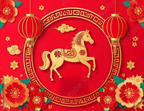 Festive Golden Horse Paper Cut Art for Lunar New Year Celebration Background Illustration