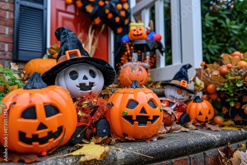 festive, halloween, decoration, include, pumpkin, scarecrow, ornamented, front, porch, create, scarey, garden, broom, glow, jar, children, fun, skittish, background, set, vignette, thrill, eerie, prop, orange, light, home, autumn, night, jack, style, fright, lawn, carve, gourd, design, sorcerer, costume, staircase, leaves, haunt, paint, display, stock, ghost, evening, gift, vignetting