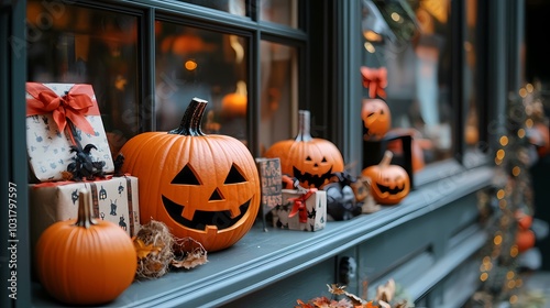 Festive Halloween display with carved pumpkins and gifts on a windowsill.