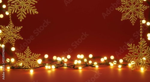snowflake, holiday, celebration, decoration, festive, glowing, illuminated, ornament, red, gold, winter, season, background, border, frame, sparkling, shiny, bright, warm, lighting, decorative, arrangement, closeup, design, element, surface, event, greeting, card, promotion, display, copy space, christmas, new year, occasion, still life, nobody, indoor, seasonal, party, elegant, hanging, displaying, illuminating, horizontal, presenting