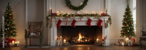 Festive holiday mantel with stockings and garlands, garland wrapped around mantel, seasonal decor, stockings hung by chimney