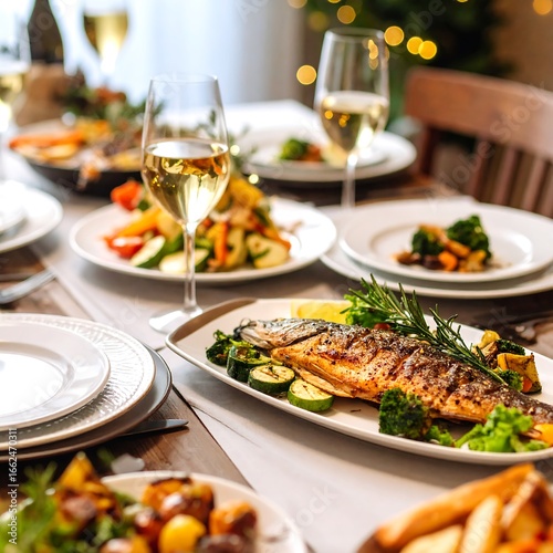 Festive holiday meal with seafood and vegetables