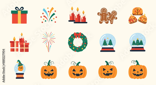 gift, present, box, red, green, fireworks, celebration, festive, holiday, candle, burning, gingerbread, cookie, decoration, chaplet, snow globe, tree, pumpkin, halloween, orange, face, smile, winter, season, ornament, cheerful, joyful, party, vector, illustration, design, isolated, graphic, element, symbol, background, creative, style, flat, icon, template, banner, card, poster, invitation, greeting, festival, decorative, commercial