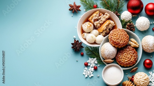 Festive homemade Christmas cookies pastries and other delicious holiday desserts presented with seasonal such as pine branches ornaments and snowflakes
