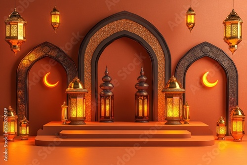 Festive Islamic Ramadan Background with Ornate Lanterns and Arches