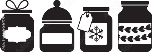 Festive Jar Silhouettes – Four Black Icons Featuring Holiday Decorations with Bow, Pom-Pom Lid, Snowflake Gift Tag, and Wreath Designs for Cozy Seasonal Vibes