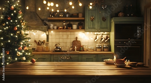 Festive kitchen backdrop with empty wooden table in foreground, Christmas tree and twinkling lights creating a warm, cozy atmosphere for holiday cooking and gatherings