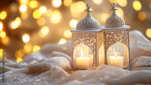 lantern, candle, light, festive, holiday, celebration, bokeh, background, fabric, decoration, ramadan, islam, muslim, faith, religion, spirituality, peace, hope, light, warmth, glow, serenity, calmness, beauty, elegance, ornate, design, pattern, texture, art, culture, tradition, event, festival, occasion, ambience, mood, atmosphere, sparkle, shine, bright, gold, white, elegant, romantic