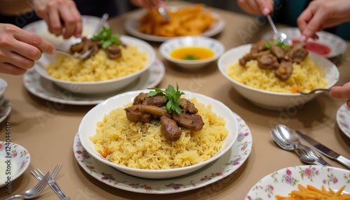Festive meal with savory plov and side dishes, a celebration of culinary traditions