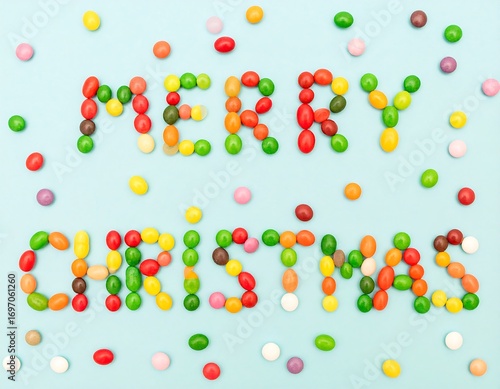 Festive message: Merry Christmas spelled out with colorful candies backdrop