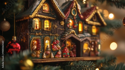 Festive miniature houses adorn a Christmas tree with soft lighting