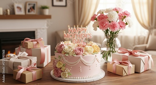 Festive Mother's Day Celebration Cake with Gifts and Flowers mothers day