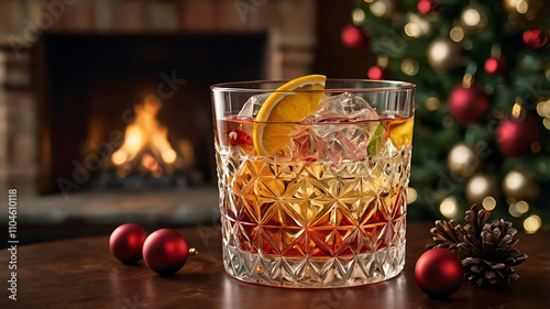 happy new year, cocktail, negroni, drink, christmas, holiday, festive, winter, celebration, alcohol, beverage, ice, orange, slice, glasses, rock, ornament, tree, fire, fireplace, home, cosy, warm, delicious, tasty, relaxing, romantic, elegant, luxurious, red, gold, wood, table, background, season, december, new year, party, gathering, spirit, aperitif, citrous, garnish, style, sophisticated
