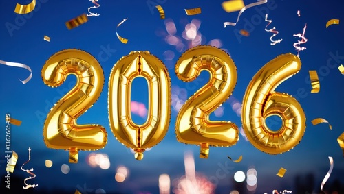festive, celebration, fireworks, balloon, 2026, new, year, gold, party, confetti, sky, blue, background, evening, night, holiday, event, countdown, joy, happiness, cheer, fun, vibrant, shimmer, metallic, number, anniversary, milestone, greeting, sparkle, excitement, atmosphere, colourful, display, cheerful, glitz, glamour, illuminated, welcoming, reflective, shining, revelry